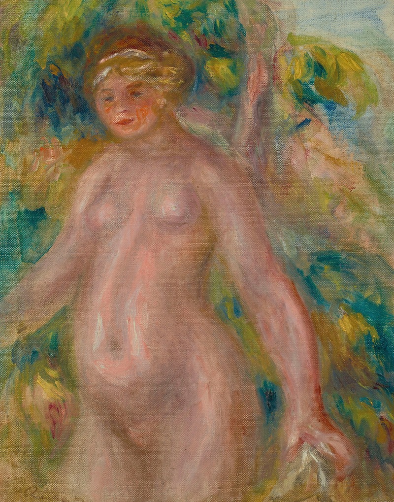 "Nu debout" is a testament to Renoir's fascination with the human body, a subject he explored extensively throughout his career. Renoir's approach to the nude was characterized by a softness and sensuality that set his work apart from many of his contemporaries. His nudes are often depicted in a naturalistic manner, with an emphasis on the play of light on skin and the gentle curves of the body.