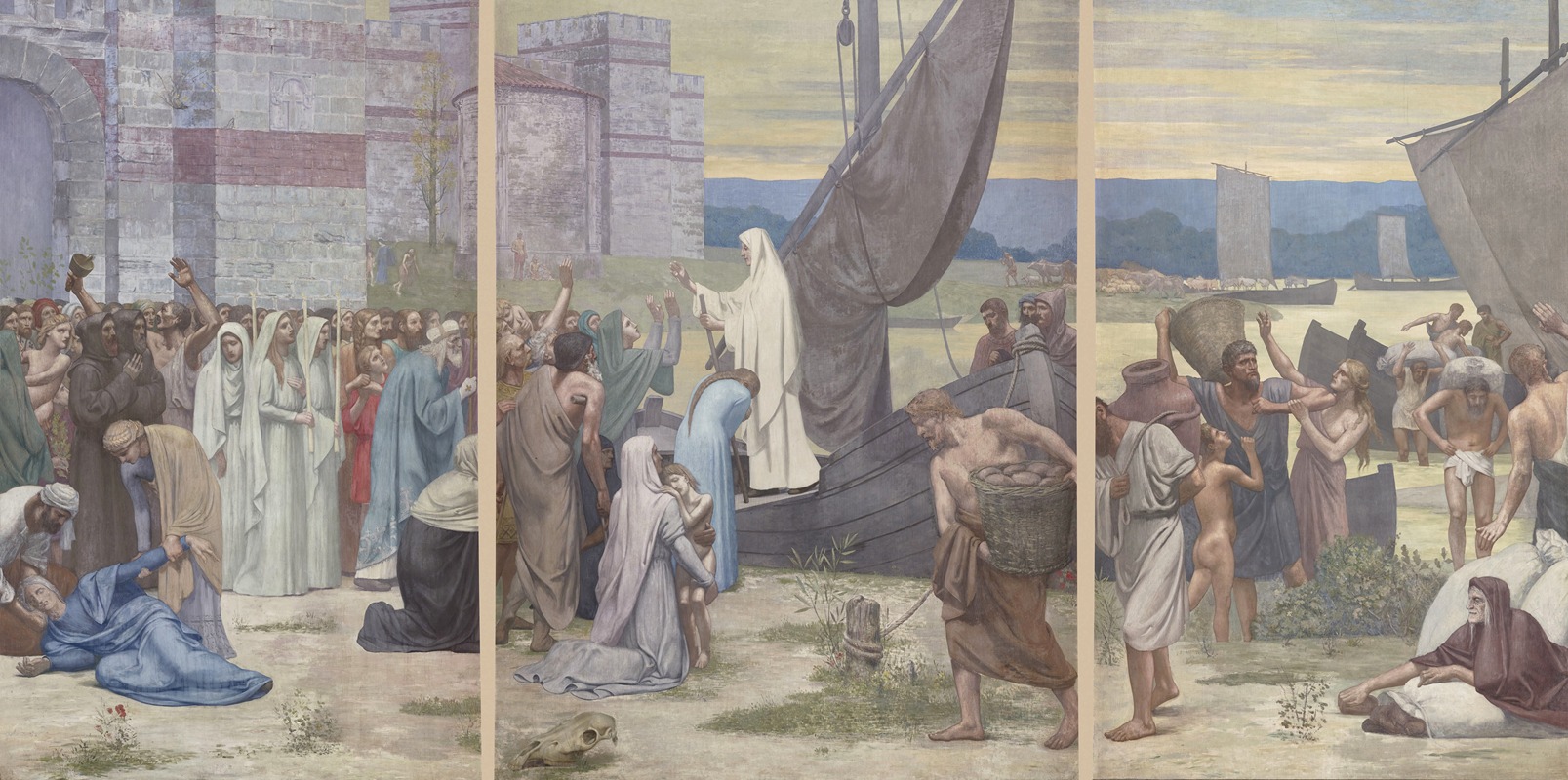 Sainte Geneviève ravitaillant Paris assiégé (Saint Genevieve Bringing Supplies to Besieged Paris) is a painting by the French artist Pierre Puvis de Chavannes, completed in 1870. This work is one of Puvis de Chavannes' many depictions of Saint Genevieve, the patron saint of Paris, and reflects his interest in historical and allegorical themes. The painting portrays Saint Genevieve as a central figure, symbolizing hope and resilience during a time of crisis.