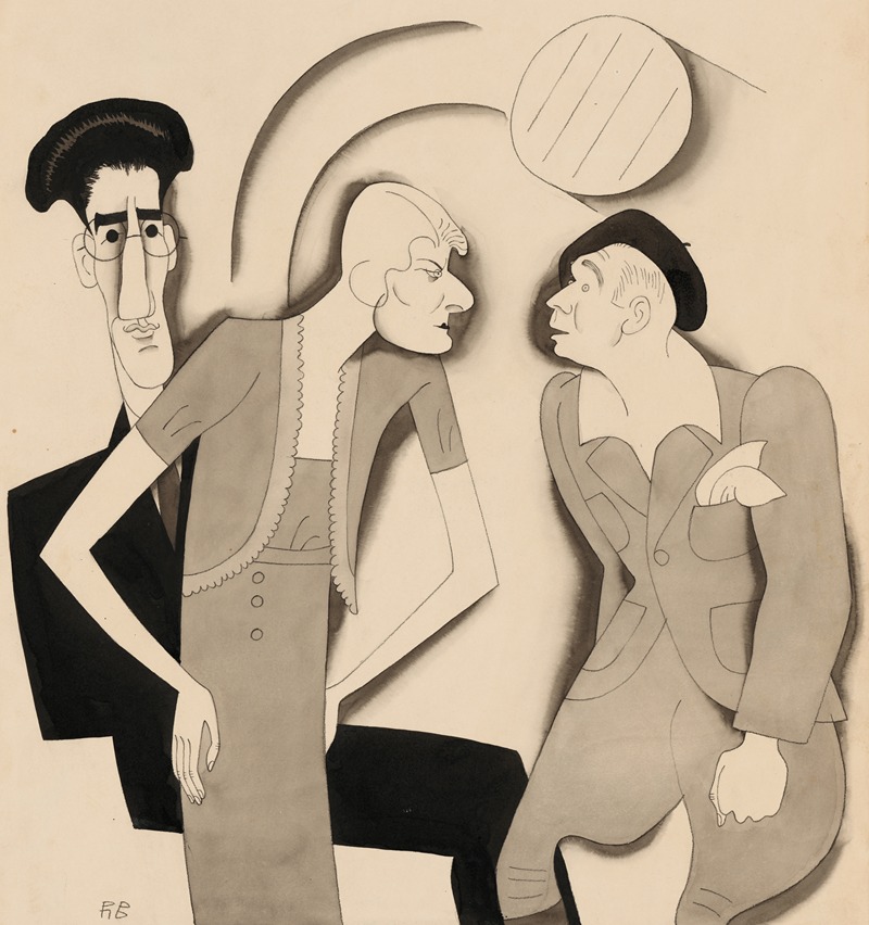 The caricature likely dates to the 1920s or 1930s, a period when both Barton and Kaufman were at the height of their respective careers. During this time, Kaufman was involved in the creation of numerous acclaimed works, including The Royal Family (1927), Animal Crackers (1928), and Of Thee I Sing (1931), the latter of which became the first musical to win the Pulitzer Prize for Drama. Barton’s depiction of Kaufman captures the playwright’s reputation as a sharp and sardonic figure, traits that were often reflected in his writing and public persona.