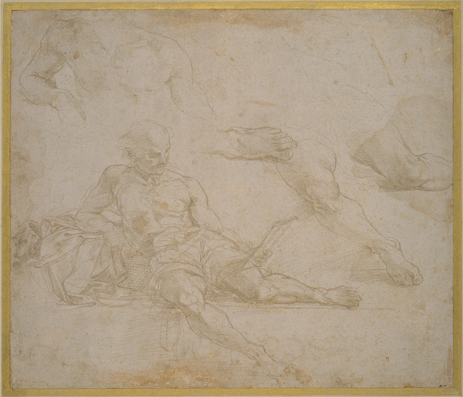 Raphael's "Study of ‘Diogenes’ in the ‘School of Athens’" is a preparatory drawing for one of the figures in his renowned fresco, "The School of Athens," located in the Apostolic Palace in the Vatican. Raphael, an Italian painter and architect of the High Renaissance, is celebrated for his mastery of form and composition, and "The School of Athens" is one of his most famous works, completed between 1509 and 1511 as part of his commission to decorate the rooms now known as the Stanze di Raffaello.