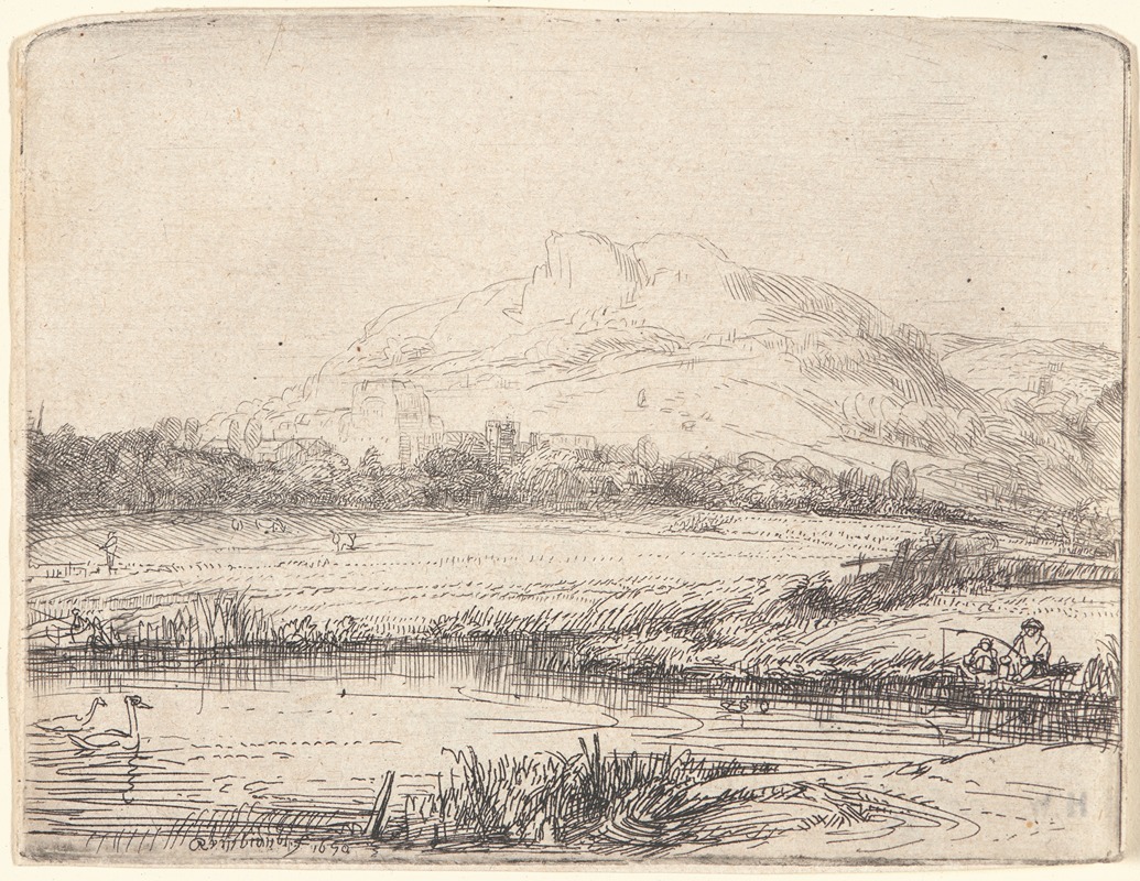 This etching is believed to have been created around 1650, during a period when Rembrandt was particularly focused on exploring landscapes in his prints. Unlike his grand historical paintings or dramatic biblical scenes, his landscape etchings often reflect a more intimate and observational approach, capturing the everyday beauty of the Dutch countryside. These works are considered significant for their ability to convey mood and atmosphere, often with minimalistic compositions.