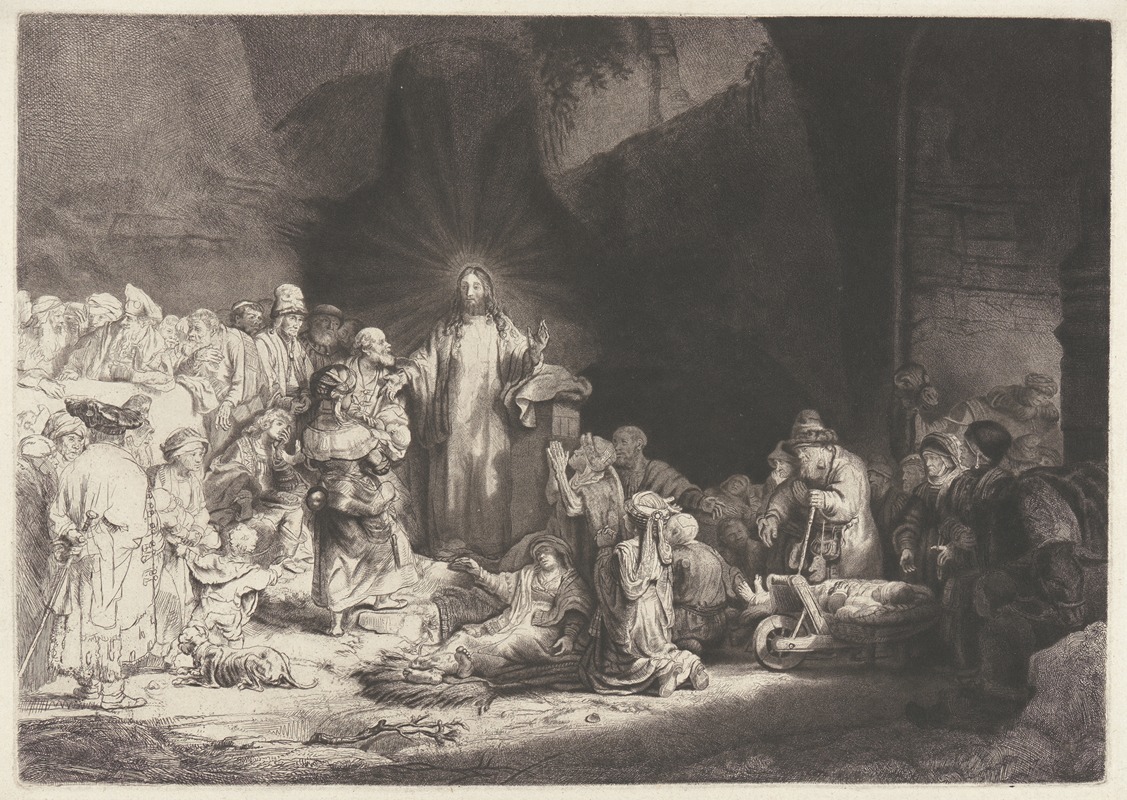 Rembrandt's use of light and shadow in this etching is particularly noteworthy. He employs chiaroscuro to dramatic effect, creating a strong contrast between the illuminated figure of Christ and the darker, more shadowy figures surrounding him. This technique not only enhances the three-dimensionality of the figures but also underscores the spiritual significance of the scene, with Christ as the source of divine light and healing.