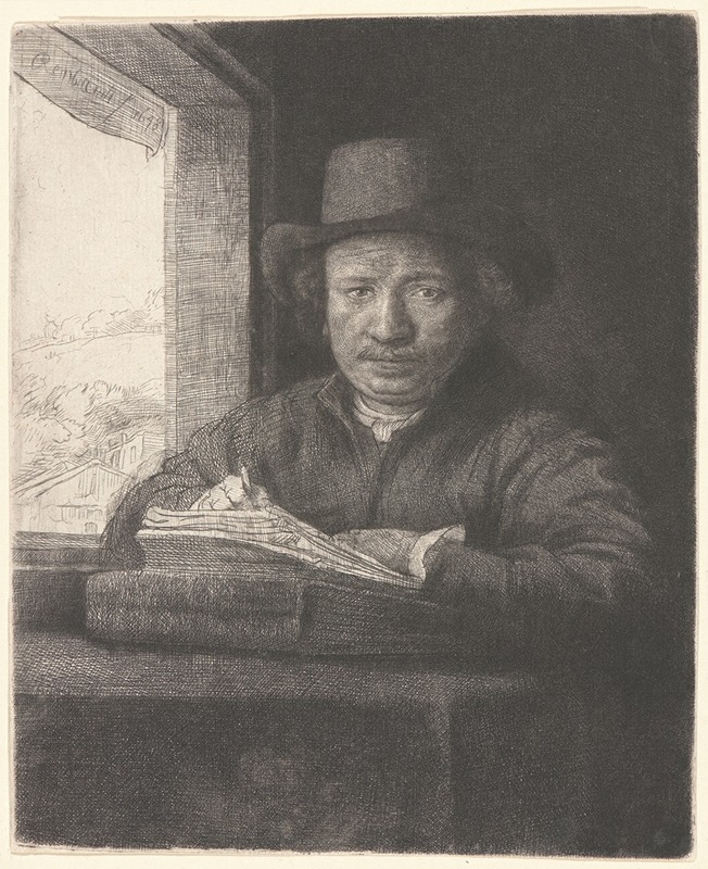 The drawing depicts Rembrandt seated at a window, deeply engaged in the act of drawing. He is shown with a concentrated expression, holding a drawing tool in his hand. The composition is intimate and informal, reflecting Rembrandt's interest in portraying the act of creation itself. The window serves as a framing device, emphasizing the artist's focus and the interplay of light and shadow, which are hallmarks of Rembrandt's work across various media.