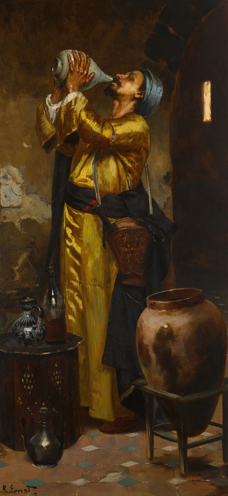 Rudolf Ernst (1854–1932) was an Austrian painter known for his Orientalist works, which often depicted scenes inspired by the cultures, architecture, and daily life of the Middle East and North Africa. One of his notable paintings, A Refreshing Drink, exemplifies his meticulous attention to detail and his fascination with the exoticism of the Orient, as perceived by European artists of his time.