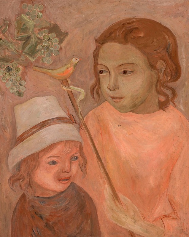 Tadeusz Makowski (1882–1932) was a Polish painter associated with the École de Paris, known for his distinctive style that combined elements of modernism, primitivism, and folk art. One of his notable works, Dzieci z ptaszkiem na drążku (Children with a Bird on a Perch), exemplifies his fascination with childhood innocence and simplicity, themes that frequently appear in his oeuvre.