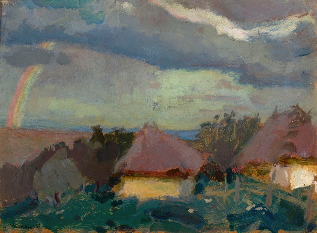"Rural Landscape with a Rainbow" is one of Makowski's works that reflects his unique style, which combines elements of folk art with modernist influences. The painting depicts a serene rural scene, capturing the simplicity and tranquility of the countryside. The presence of a rainbow adds a touch of whimsy and color, contrasting with the more muted tones of the landscape. Makowski's use of color and form in this painting demonstrates his ability to blend traditional and modern techniques, creating a harmonious composition that is both nostalgic and innovative.