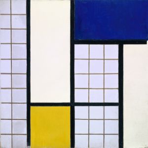 The painting exemplifies the De Stijl aesthetic with its use of straight lines, right angles, and a limited palette of primary colors (red, blue, and yellow), along with black, white, and gray. These elements are arranged in a balanced and harmonious composition, reflecting the movement's emphasis on order and clarity. Van Doesburg's work often incorporated diagonal lines, which distinguished his style from Mondrian's more rigidly horizontal and vertical compositions.