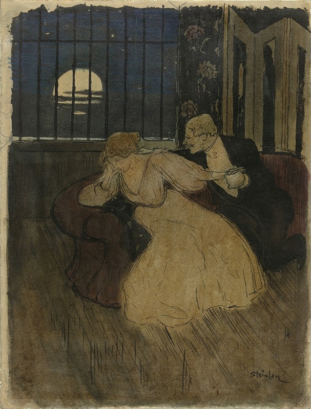 The composition of the painting is intimate, drawing the viewer into the private moment shared between the two figures. The gentleman, dressed in a formal tailcoat, is depicted in a posture of persuasion, suggesting a conversation or negotiation taking place. The lady, seated on a sofa, appears hesitant, her body language conveying a sense of contemplation or reluctance. Steinlen's use of color and light enhances the emotional tension in the scene, highlighting the contrast between the figures and their surroundings.