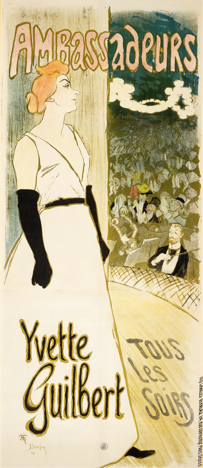 In his portrayal of Yvette Guilbert, Steinlen captures not just her physical likeness but also the essence of her stage persona. The artwork reflects her distinctive style and the theatricality that made her a beloved figure in the world of cabaret. Steinlen's use of line and form in this piece highlights Guilbert's expressive features and the elegance of her performance attire, emphasizing her role as a cultural icon of her time.