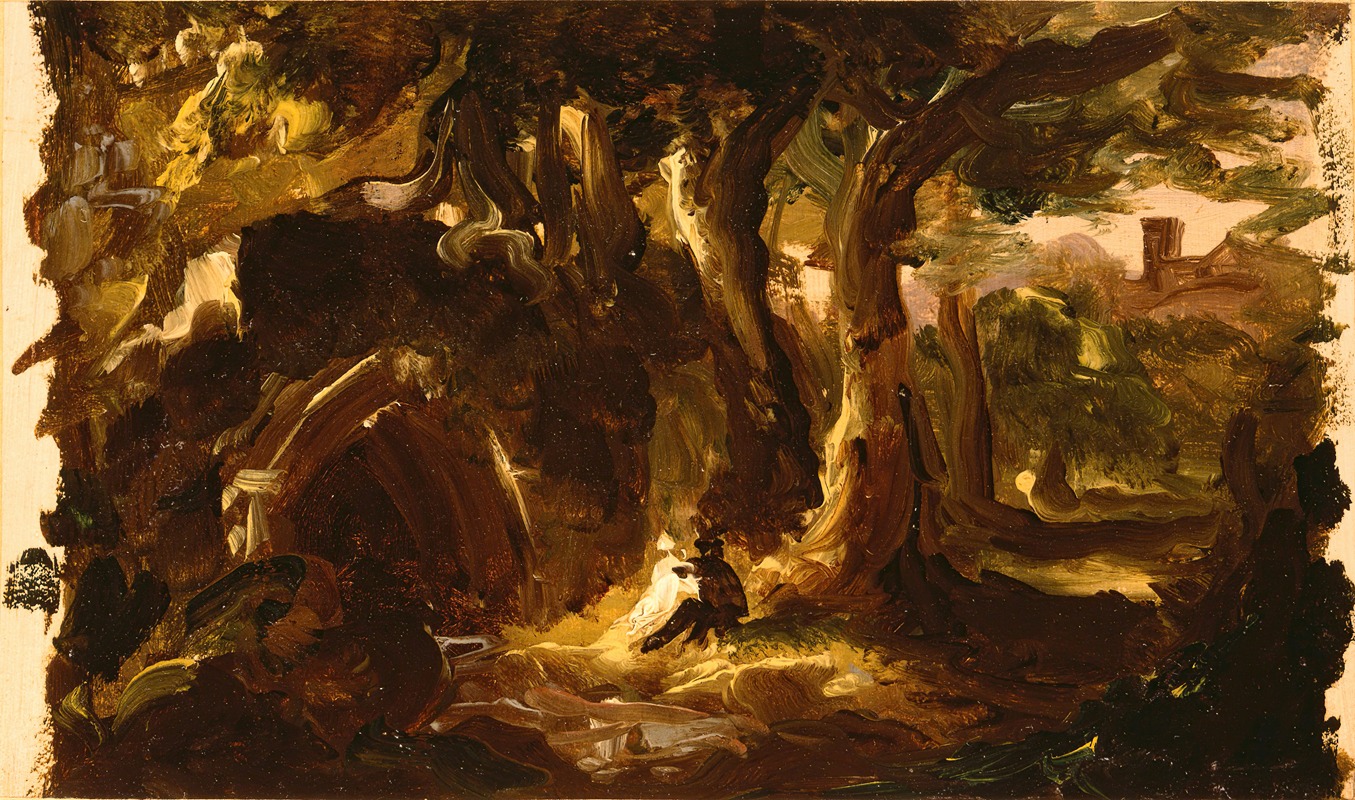 "Wooded Landscape with Figures" is an example of Cole's early work, showcasing his meticulous attention to detail and his ability to capture the interplay of light and shadow. The painting is part of a broader body of work that helped establish Cole's reputation as one of America's foremost landscape painters.