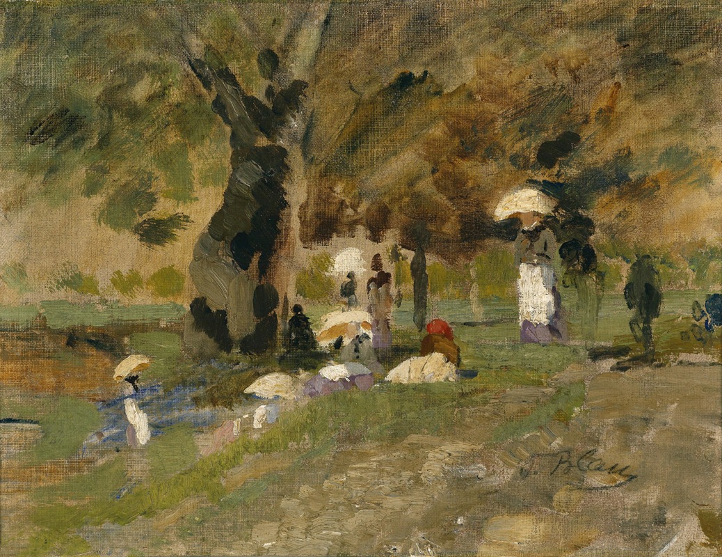 The painting depicts a serene summer scene in the Prater, a large public park in Vienna, Austria. The Prater, historically a hunting ground for Austrian royalty, became a public recreational area in 1766 and has since been a popular destination for leisure and relaxation. Blau's depiction of the park captures its tranquil beauty, with lush greenery, dappled sunlight, and figures enjoying the natural surroundings. The composition reflects her mastery of light and color, as well as her ability to convey the peaceful ambiance of the setting.