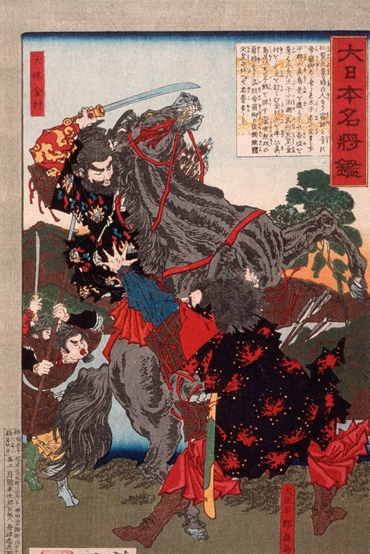Overall, "Ōtomo no Kanemura Fighting the Usurper Ōtodo Matori" exemplifies Yoshitoshi's talent for storytelling through art, capturing a moment of historical intrigue with vivid imagery and emotional depth. The print remains a testament to Yoshitoshi's enduring legacy as one of Japan's most influential ukiyo-e artists.