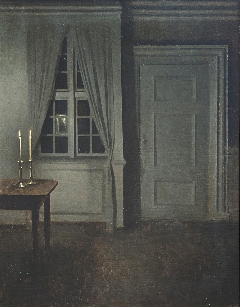 Hammershøi often painted interiors of his own home in Copenhagen, particularly the apartment he shared with his wife, Ida, at Strandgade 30. While it is not definitively confirmed that Interior with Two Candles depicts this specific location, many of his works are set in this familiar environment. His interiors frequently feature closed doors, windows, and sparse furnishings, emphasizing a sense of stillness and mystery. The absence of human figures in this painting is also characteristic of Hammershøi's approach, as he often focused on the interplay between light, space, and objects rather than narrative or overt symbolism.