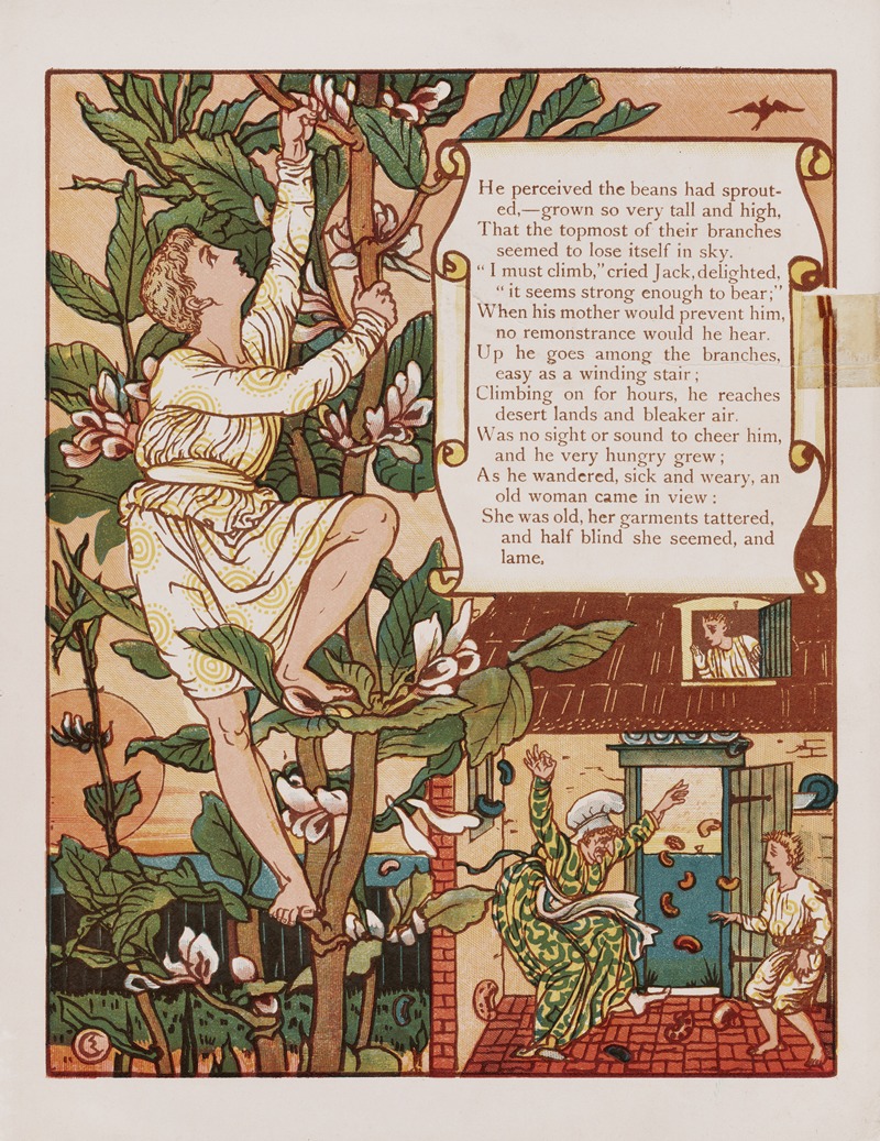 "Jack and the Bean-stalk Pl.3" is part of a series of illustrations created by Crane for the fairy tale "Jack and the Beanstalk," which was published in various editions of children's books. Walter Crane's illustrations are celebrated for their intricate detail, vibrant colors, and the ability to capture the essence of the story. His work in this series is a testament to his skill in blending narrative and visual art, making the story accessible and engaging for young readers.