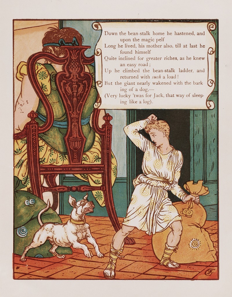 In summary, "Jack and the Bean-stalk Pl.6" by Walter Crane is a significant piece of art that exemplifies Crane's skill as an illustrator and his contribution to children's literature. The illustration is part of a larger body of work that has left a lasting impression on the world of book illustration and the Arts and Crafts Movement.