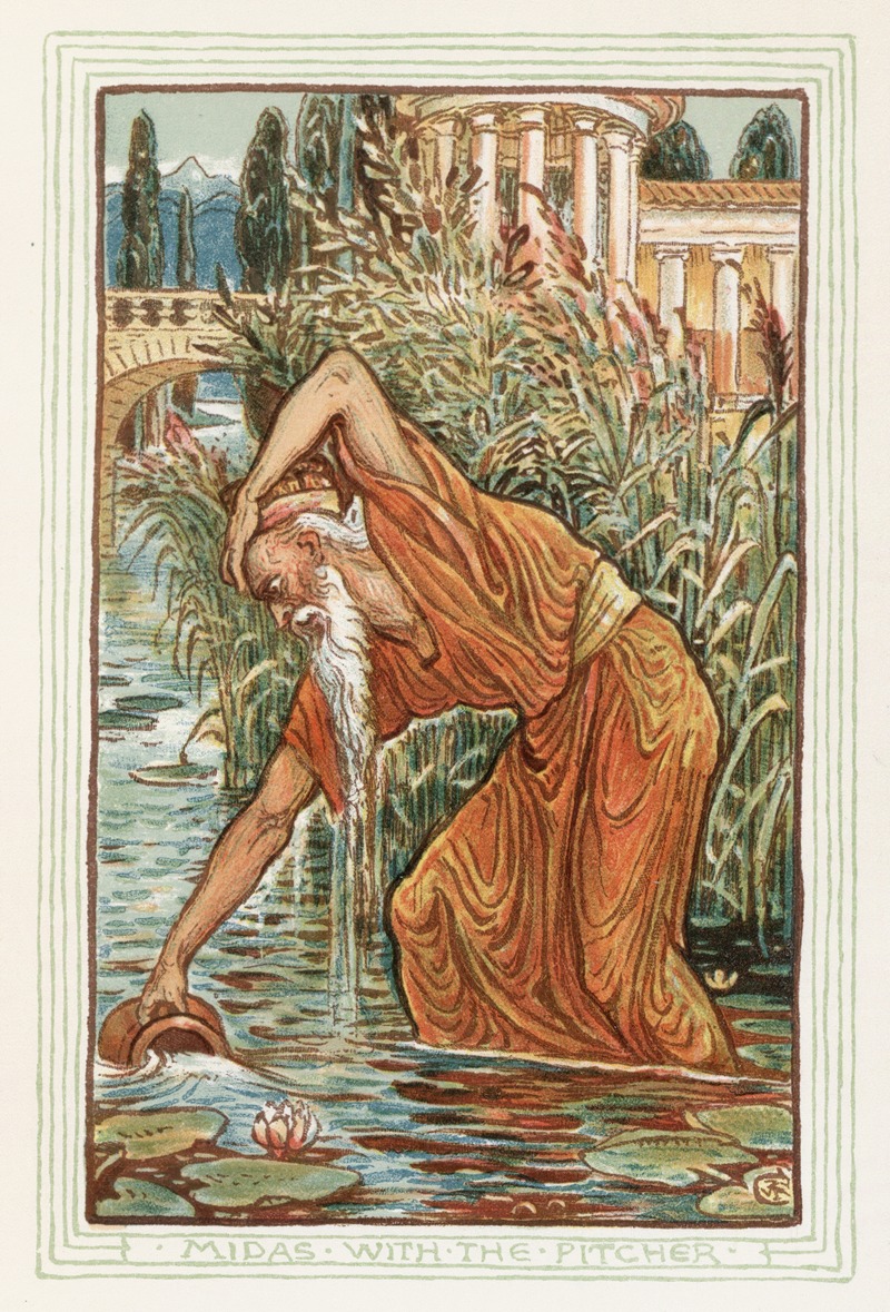 Overall, "Midas with the Pitcher" by Walter Crane is a testament to his skill as an illustrator and his ability to convey complex themes through his art. The illustration remains a notable example of his work and continues to be appreciated for its artistic and historical significance.