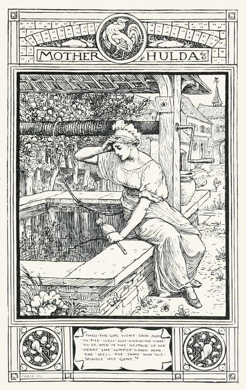 Walter Crane's "Mother Hulda" is an illustration created by the renowned English artist and book illustrator Walter Crane (1845–1915). Crane was a leading figure in the Arts and Crafts Movement and is celebrated for his contributions to children's book illustrations and decorative arts. His works often featured intricate designs, vivid colors, and themes drawn from mythology, folklore, and fairy tales.