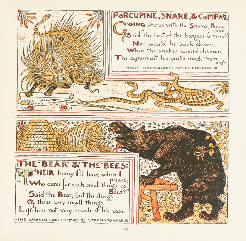 "Porcupine, Snake and Company, The Bear and the Bees" is one of Crane's illustrations, which reflects his distinctive style and artistic philosophy. Walter Crane's illustrations often accompanied fables, fairy tales, and nursery rhymes, bringing stories to life with his imaginative and detailed artwork. His illustrations were not just mere decorations but were integral to the storytelling, enhancing the narrative through visual means.