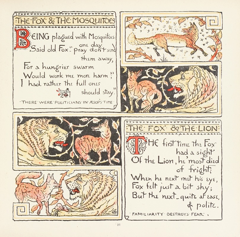 "The Fox and the Mosquitoes" and "The Fox and the Lion" are part of Crane's series of illustrations for Aesop's Fables. Aesop's Fables are a collection of stories attributed to Aesop, a slave and storyteller believed to have lived in ancient Greece. These fables are known for their moral lessons, often conveyed through anthropomorphic animals.