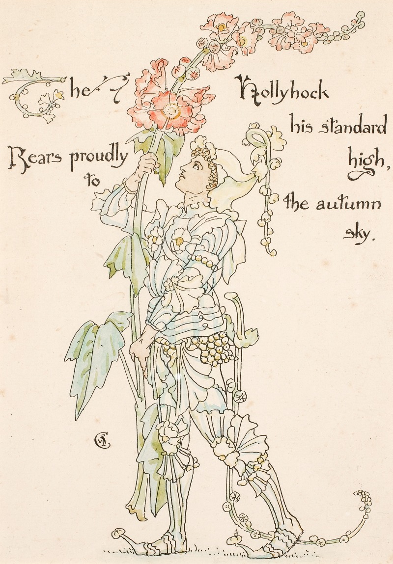 In addition to his work as a painter, Crane was also a prolific book illustrator. He collaborated with several prominent authors of his time, including Edmund Evans, for whom he illustrated numerous children's books. Crane's illustrations were known for their rich colors and intricate designs, which often included floral and natural elements similar to those seen in "The Hollyhock his standard high, Rears proudly to the autumn sky."