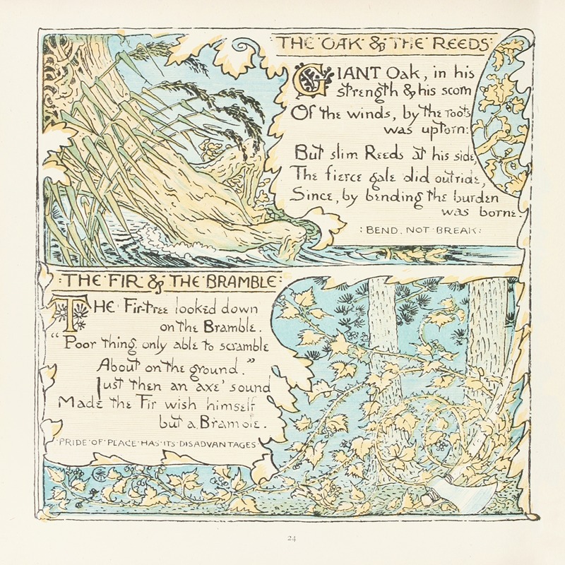 Walter Crane (1845–1915) was a prominent English artist and book illustrator, known for his contributions to the Arts and Crafts Movement and his work in children's literature. Among his many works, "The Oak and the Reeds" and "The Fir and the Bramble" are notable illustrations that reflect his distinctive style and artistic philosophy.