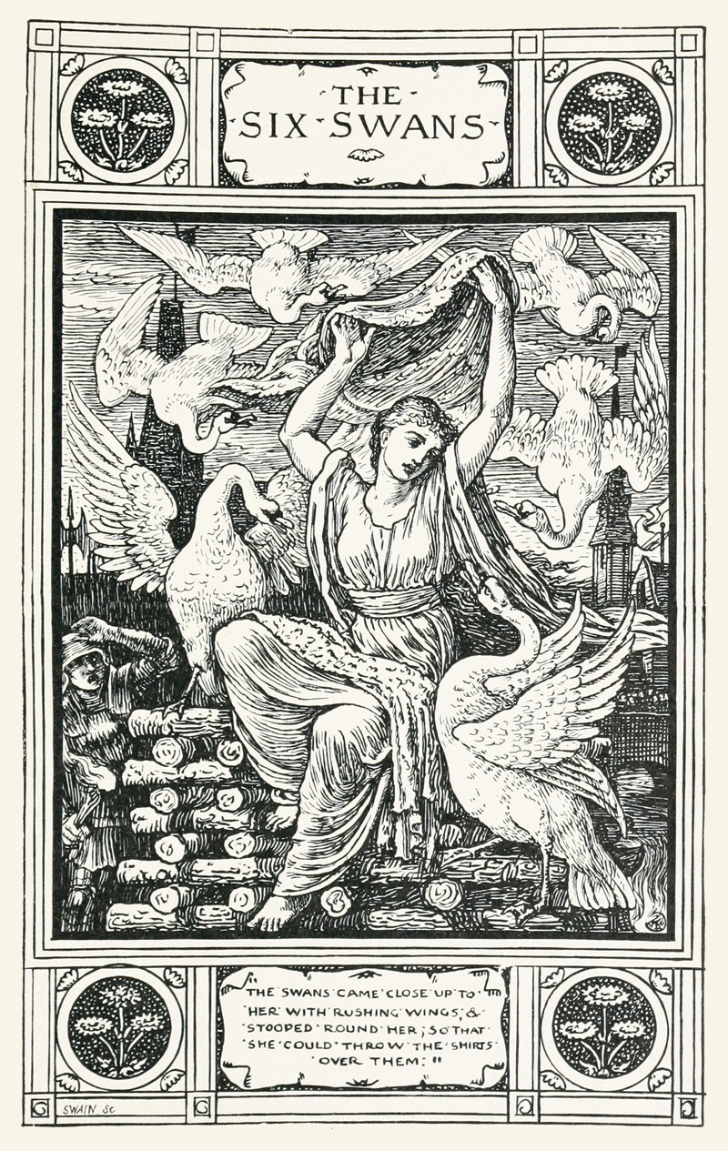 Walter Crane (1845–1915) was a prominent English artist and illustrator associated with the Arts and Crafts Movement. He is well-known for his contributions to children's book illustrations and his work in decorative arts. One of his notable works, "The Six Swans," is an illustration based on the fairy tale of the same name, which originates from the Brothers Grimm's collection of German folklore.