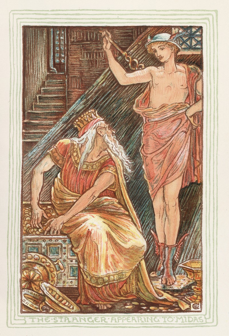 In summary, "The Stranger Appearing to Midas" by Walter Crane is a painting that illustrates a moment from Greek mythology with the artist's characteristic style and attention to detail. It embodies the themes and values of the Arts and Crafts Movement, of which Crane was a leading figure.