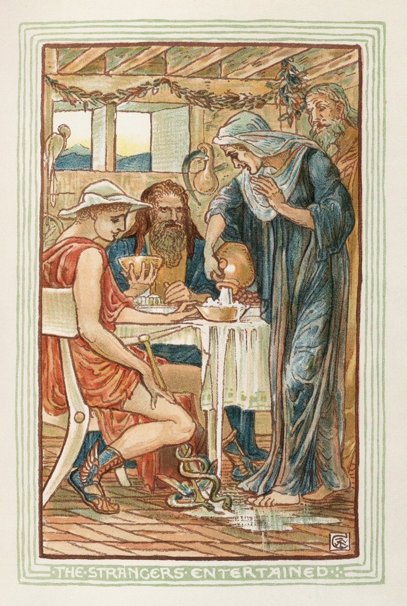 "The Strangers Entertained" is a notable artwork created by Walter Crane, an influential English artist and illustrator associated with the Arts and Crafts Movement. Born in Liverpool in 1845, Crane became one of the most prolific and influential artists of the late 19th and early 20th centuries. His work spanned various mediums, including painting, illustration, and design, and he is particularly renowned for his contributions to children's book illustrations.