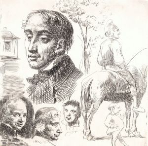 Prøveblad i stylografi med portræthoveder, bonde til hest m.m.