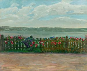 Rose fence with view of the Berg Castle at Lake Starnberg