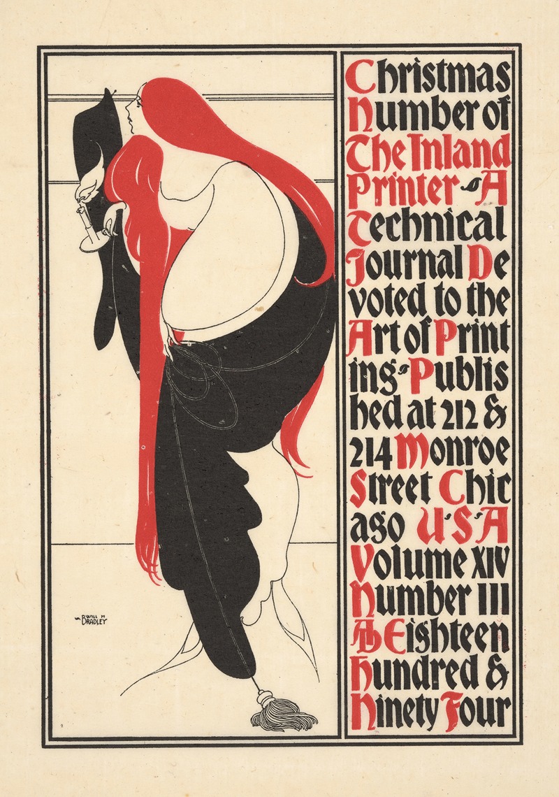 Will Bradley's cover design for the Christmas issue of The Inland Printer (vol. XIV, no. 3, 1894) is a notable example of American Art Nouveau. Bradley, often referred to as the "Dean of American Designers," was a prominent illustrator, typographer, and graphic artist during the late 19th and early 20th centuries. His work on The Inland Printer, a trade publication for the printing industry, is widely regarded as a milestone in the history of graphic design.