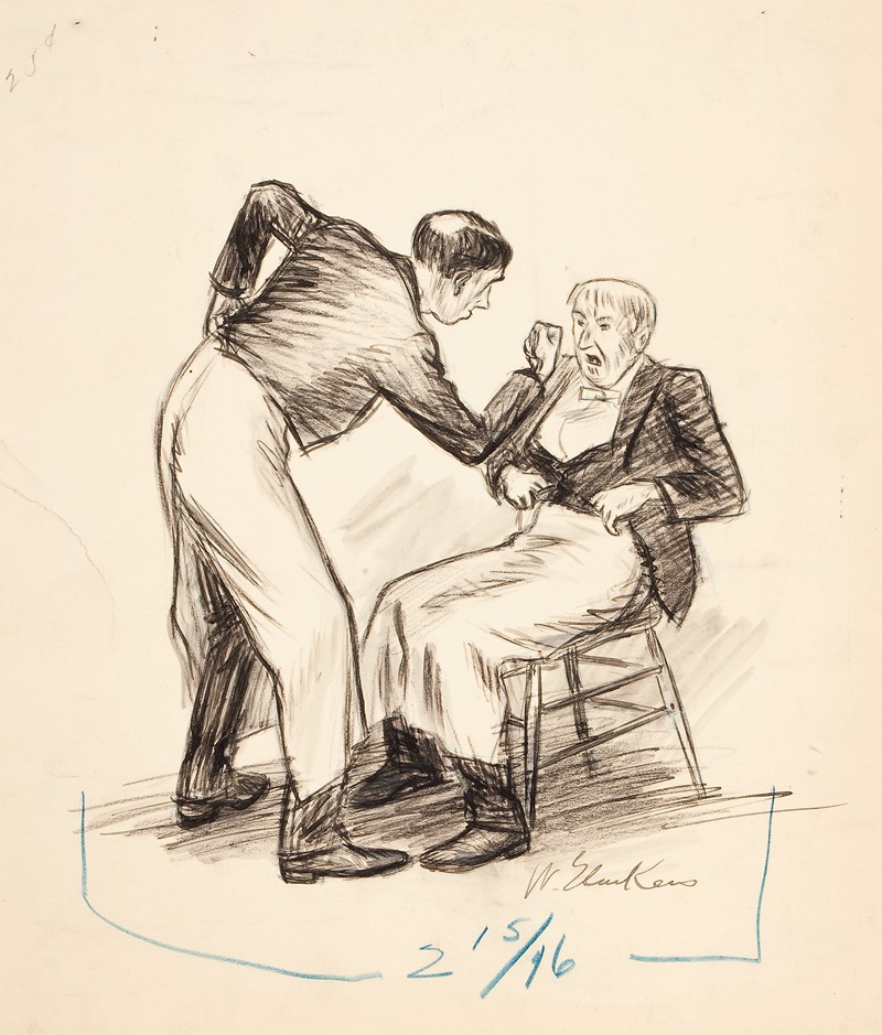 The painting portrays a chaotic and animated scene of two waiters engaged in a physical altercation. The setting appears to be a bustling restaurant or café, with other figures in the background reacting to the commotion. Glackens captures the energy and tension of the moment through his dynamic composition and expressive brushwork. The work exemplifies his ability to depict human interaction and the vibrancy of city life, themes that were central to his artistic practice.