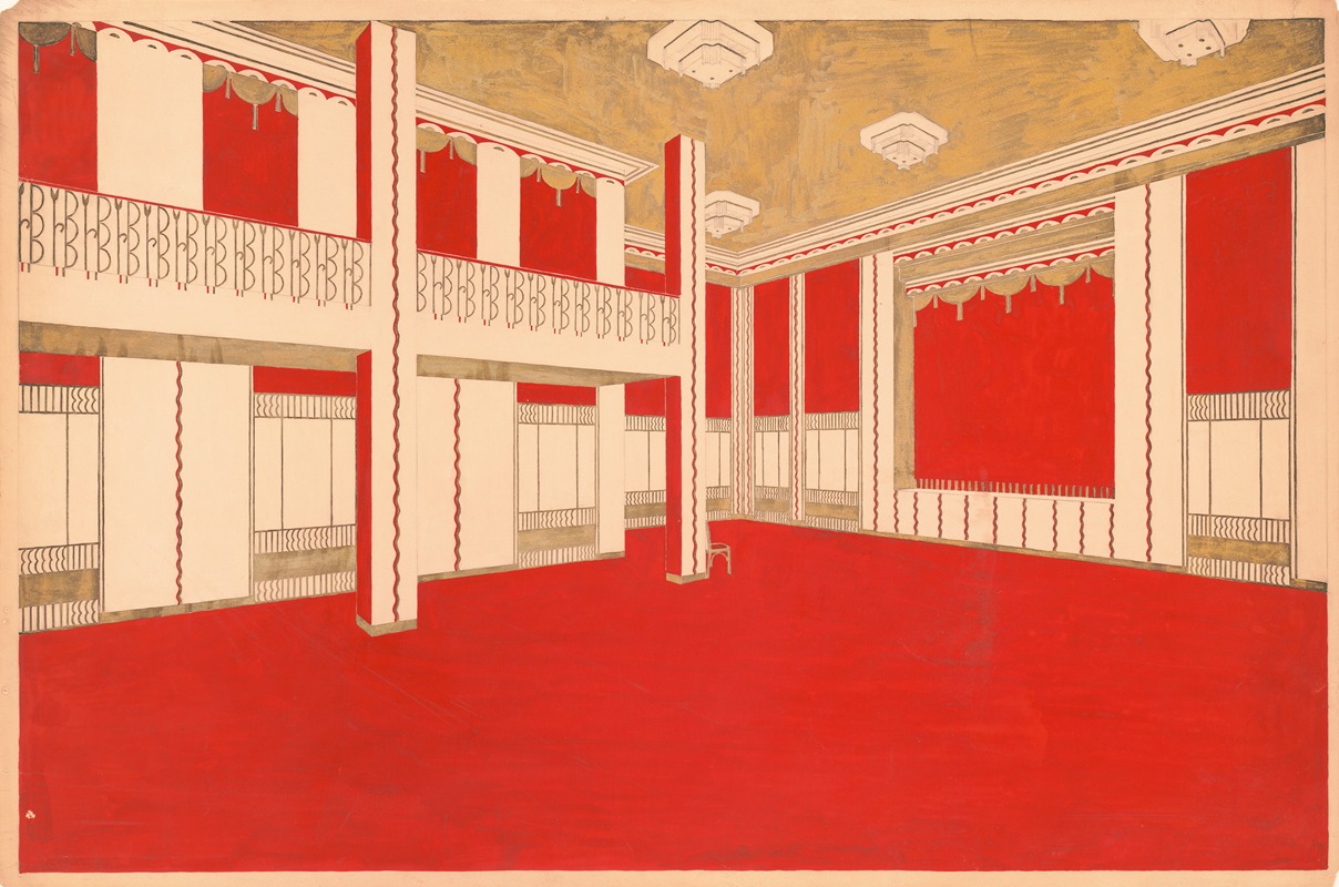 A hand-painted replica of Winold Reiss’s masterpiece Design for unidentified ballroom, probably New York City area.] [Perspective rendering in vermillion and gold, meticulously crafted by professional artists to capture the true essence of the original. Each piece is created with museum-quality canvas and rare mineral pigments, carefully painted by experienced artists with delicate brushstrokes and rich, layered colors to perfectly recreate the texture of the original artwork. Unlike machine-printed reproductions, this hand-painted version brings the painting to life, infused with the artist’s emotions and skill in every stroke. Whether for personal collection or home decoration, it instantly elevates the artistic atmosphere of any space.