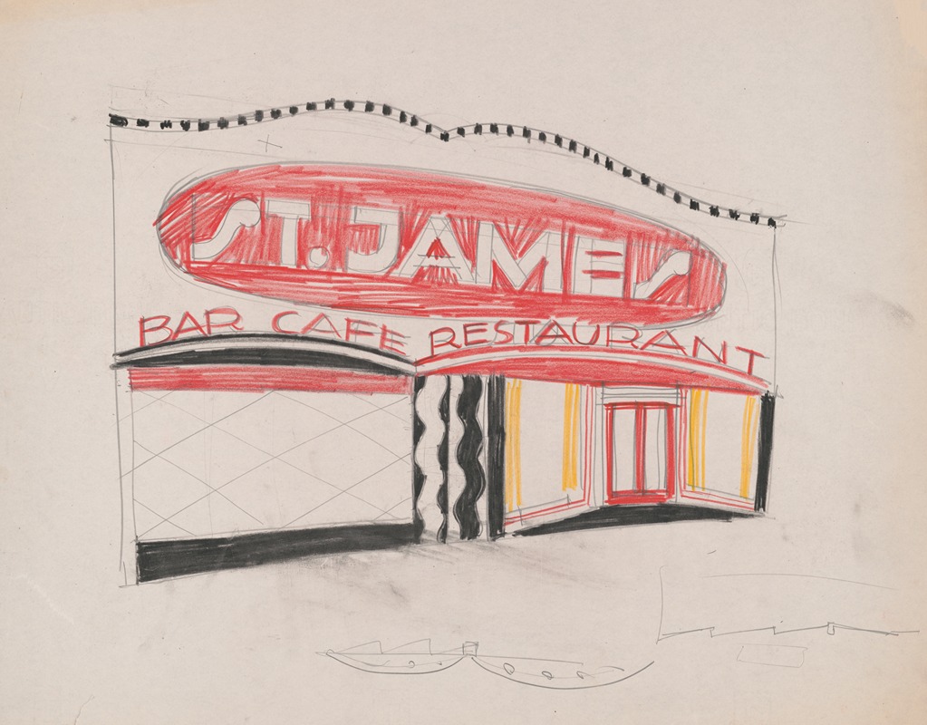 Designs and photographs for alterations to St. James Bar Restaurant, W. 181st St. and Broadway, New York, NY.] [Sketch for exterior perspective elevation and plan