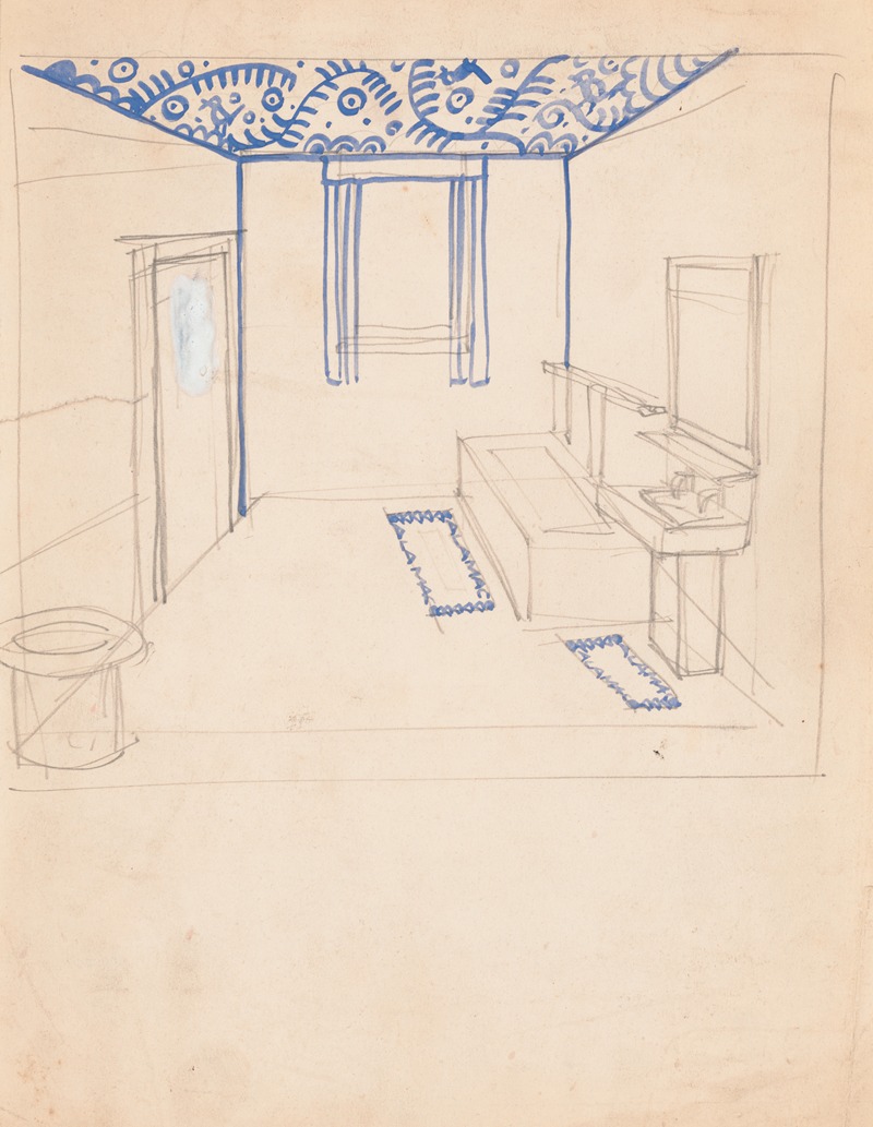 Among these sketches is an incomplete interior perspective of a bathroom. This particular piece reflects Reiss's ability to blend functionality with aesthetic appeal, a hallmark of his design philosophy. The sketch likely features elements typical of Reiss's style, such as bold colors, geometric patterns, and an emphasis on harmony between different design components. Although the sketch is incomplete, it provides insight into Reiss's creative process and his approach to interior spaces.
