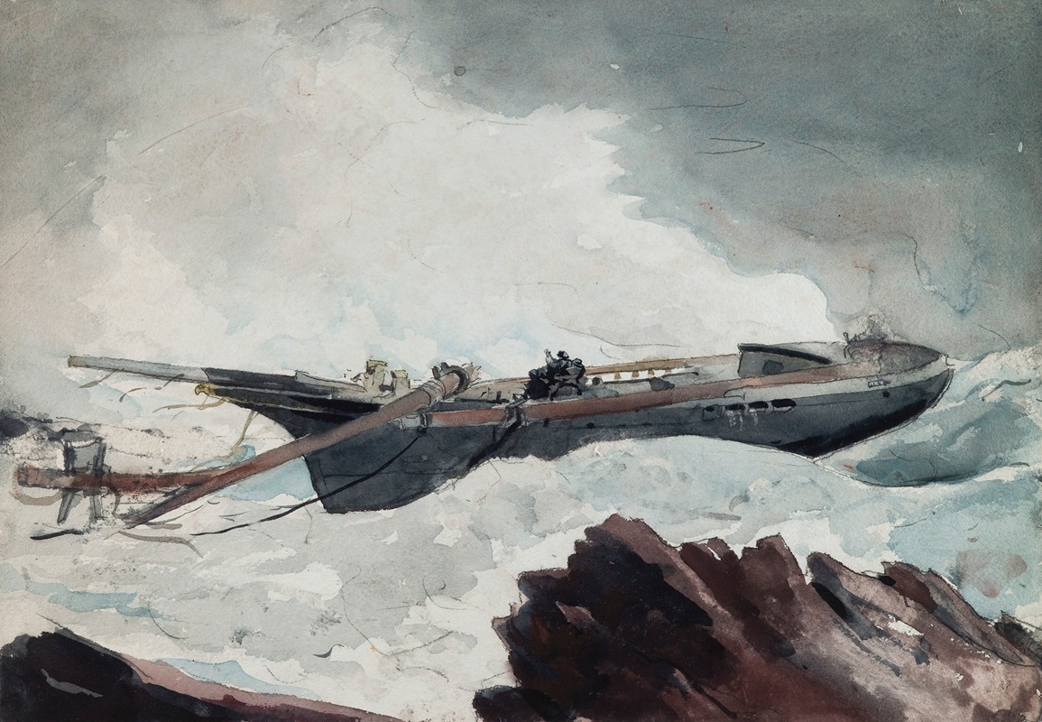 The painting depicts a schooner that has run aground, its broken hull and tattered sails indicating the severity of the storm that led to its demise. The scene is set against a tumultuous sea, with waves crashing against the wreckage and the sky filled with ominous clouds. Homer's use of color and light in this painting is particularly striking, with the dark, stormy sea contrasting sharply with the lighter tones of the schooner's sails and the foam of the waves.
