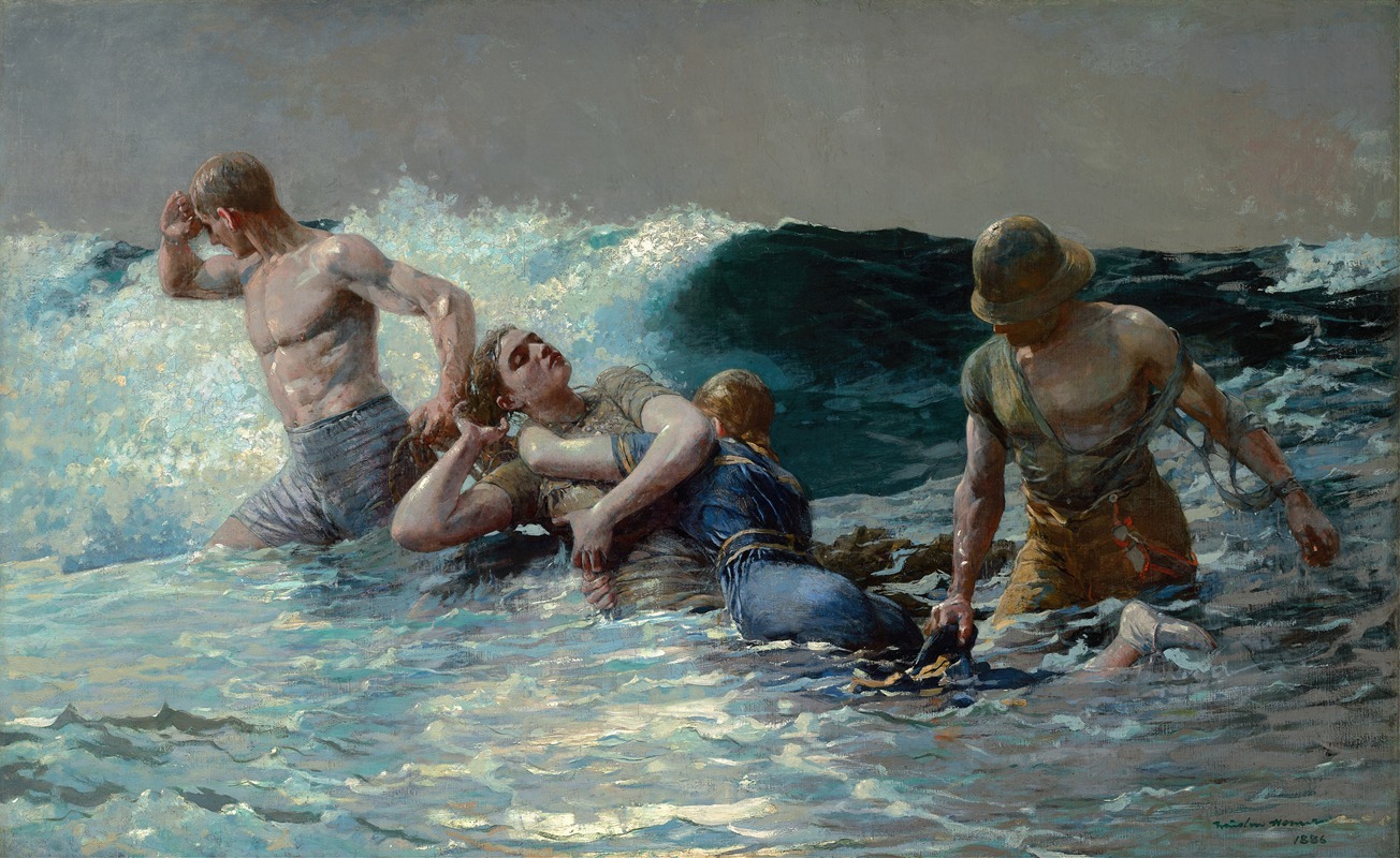 Homer's use of color and light in "Undertow" is particularly noteworthy. The palette is dominated by the cool blues and grays of the ocean, contrasted with the warm tones of the figures' skin and the white of the surf. This contrast not only highlights the figures against the turbulent background but also enhances the emotional intensity of the scene. The artist's brushwork is vigorous and expressive, capturing the movement of the water and the tension of the moment.